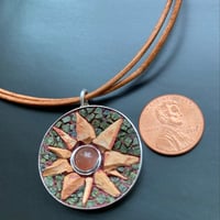 Dimensions: 1.25" sterling bezel hangs on leather cord that can be adjusted from 16" -18"