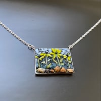 Sterling rectangle bezel filled with Black Eyed Susans growing out of Ohiopyle river rock. Pendant measures approx. 1.3" x 1" and filled with glass, moss agate and river rock. Strung on a sterling chain that can be worn at 16", 18" or 20".