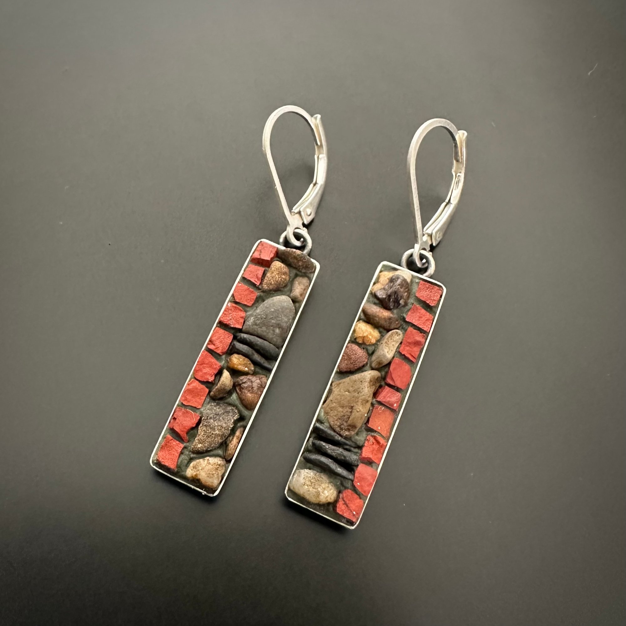 Ohiopyle, PA river rock is tweezer set alongside Red Jasper. Sterling silver bezels and lever back ear wires. See Penny for scale
