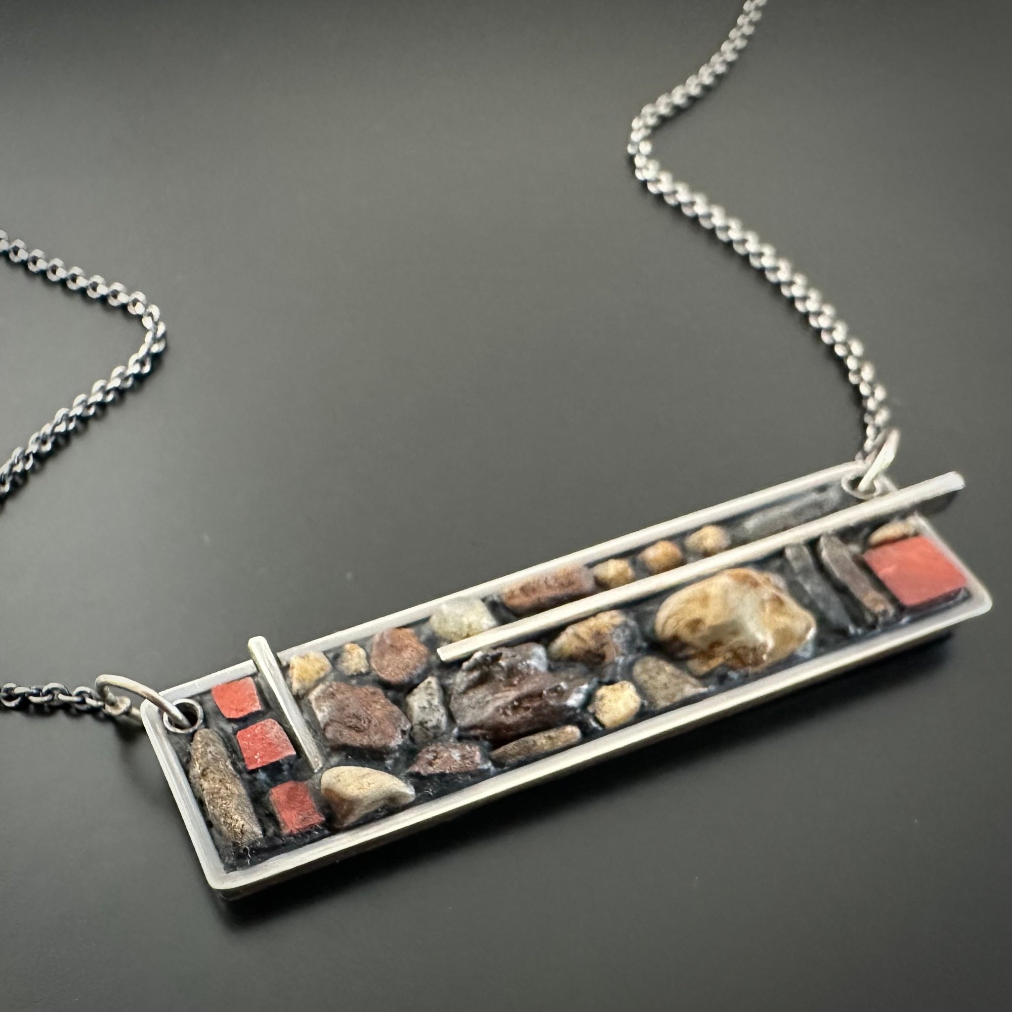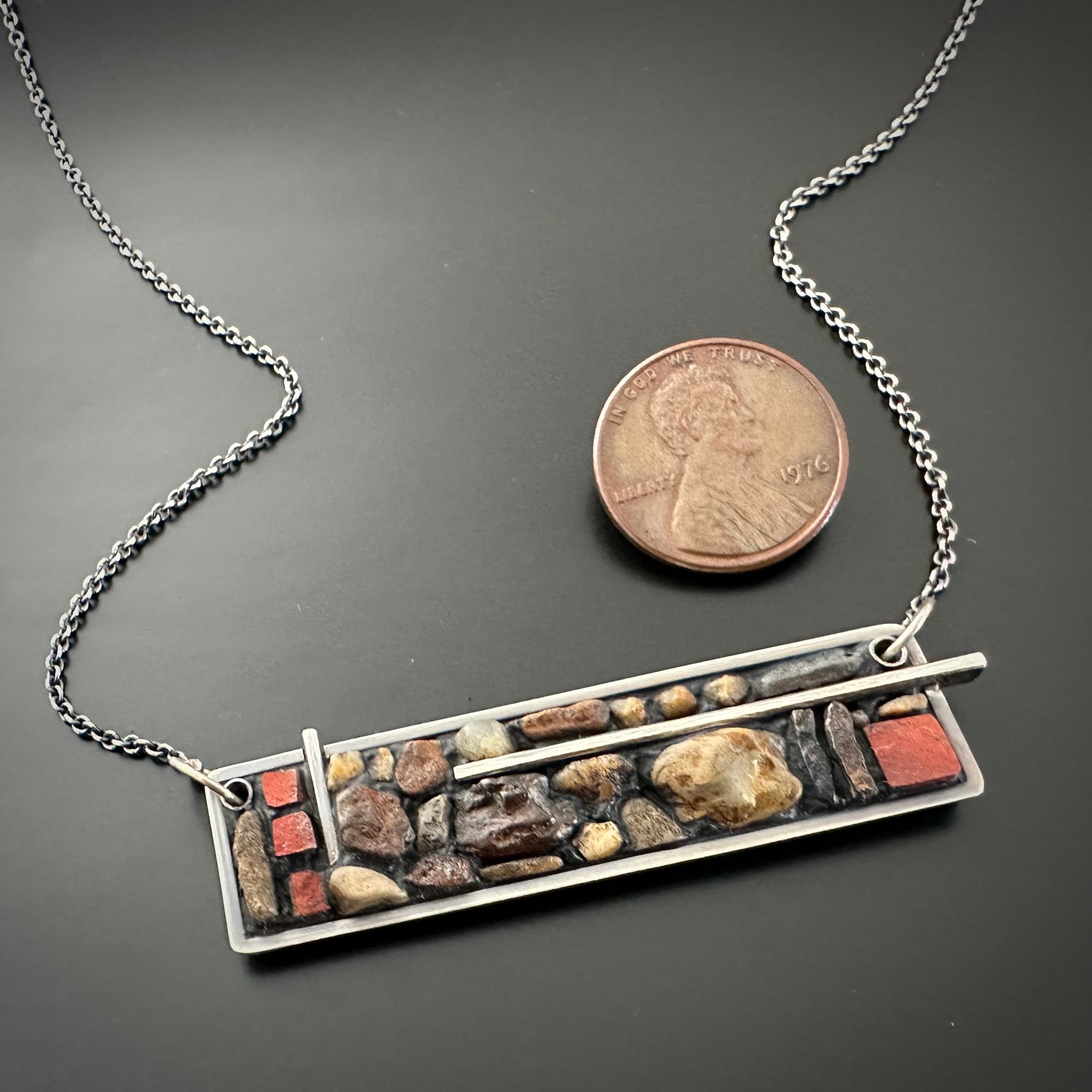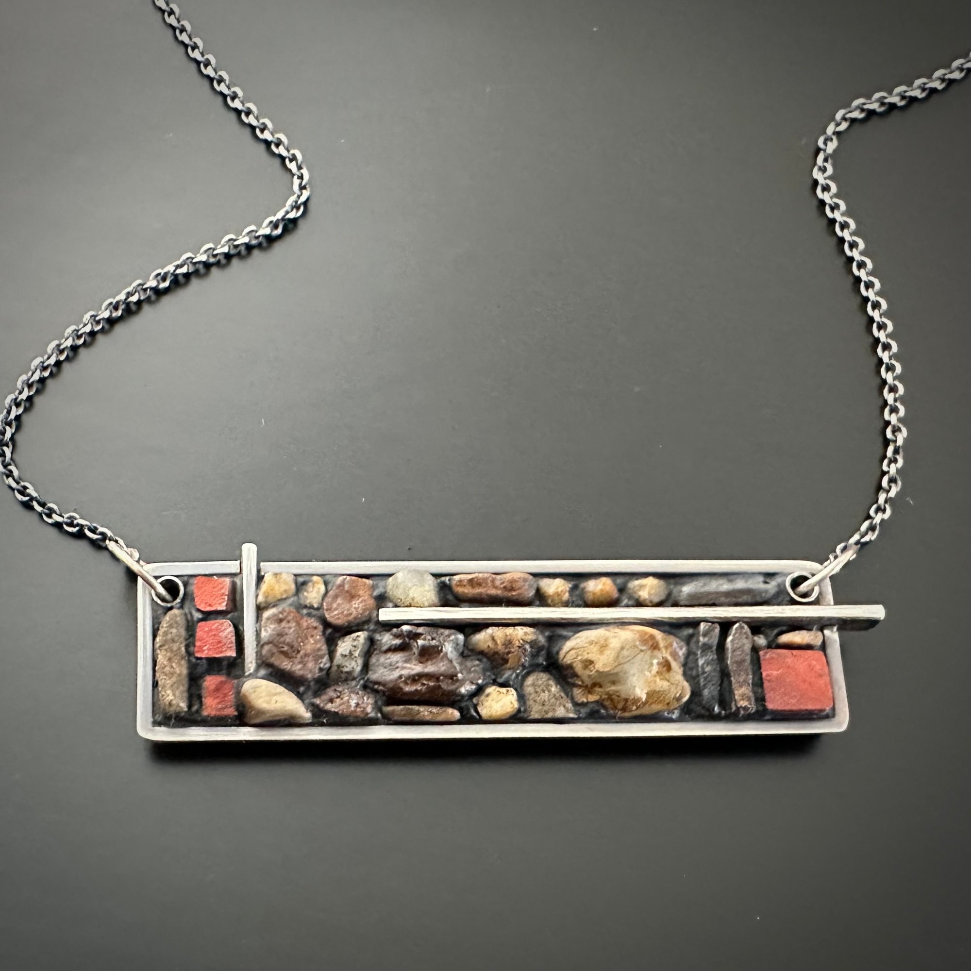 Handcrafted Sterling bezel filled with Ohiopyle pebbles, Red Jasper and Sterling bars. Sterling chain can be worn at 19” or 17”. Bezel measures approximately 2” x 1/2” high.