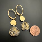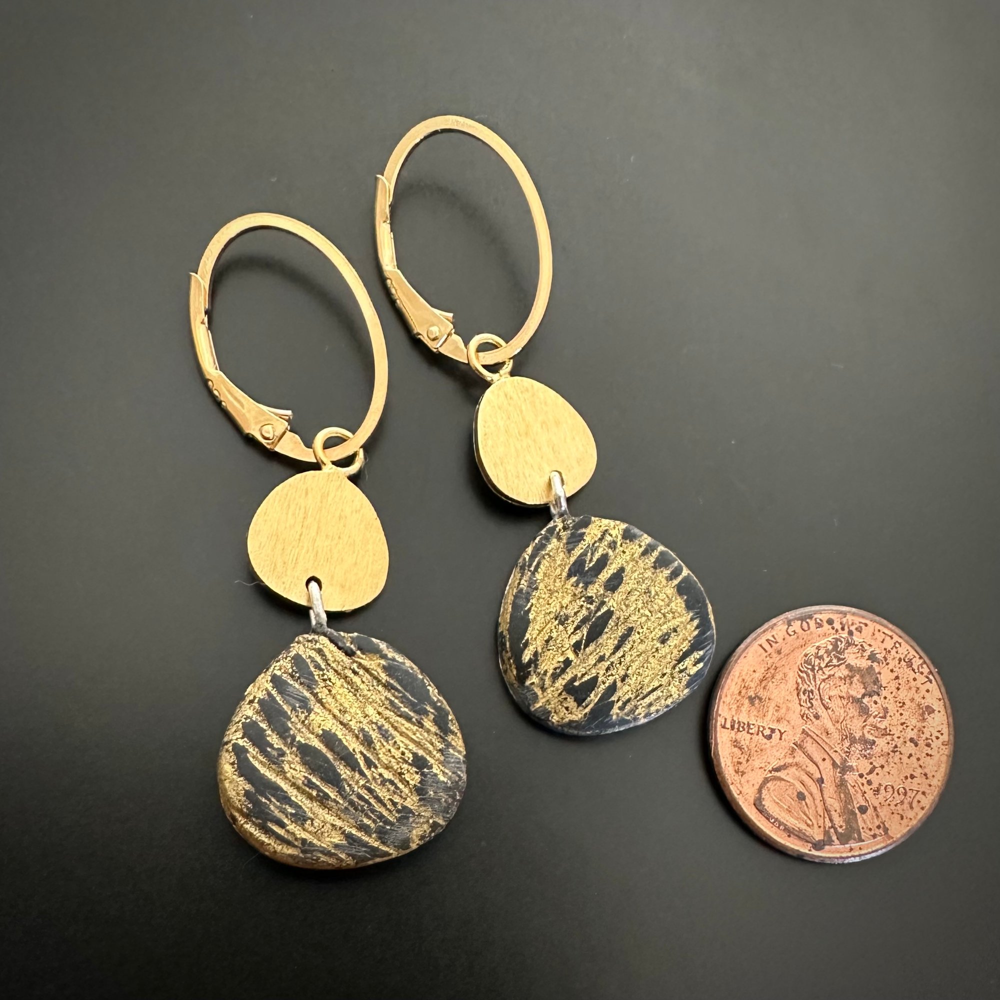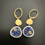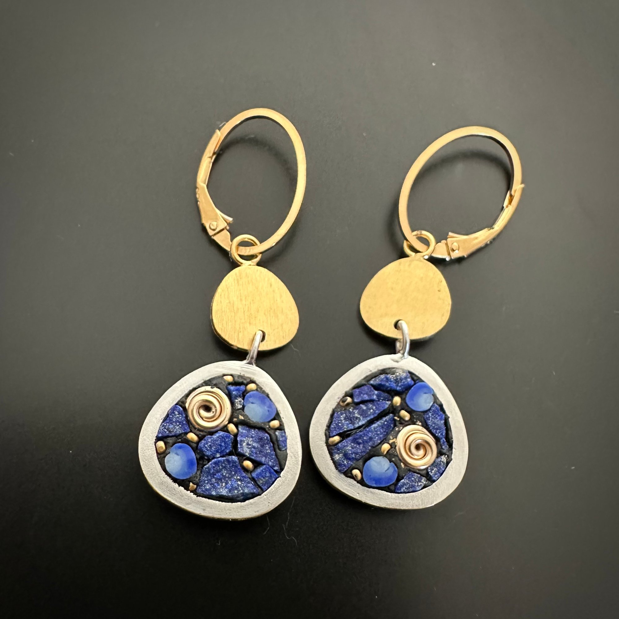Sterling bezel filled with Lapis, Italian filati glass and 14k gold filled swirls. Reverses to black and 24k gold leaf. Accented with gold plated topper and ear wires. Penny for scale.