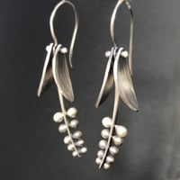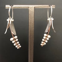 Pendant is fabricated from pierced wire threaded and defined by melted beads. Leaves are hammer textured out of sheet and dangle independently from stem. Sweet and simple! Strung on a 17" sterling chain. Pendant is 1" long by 1/2" wide. Shown in a rose gold filled with sterling finish. Pendant and earrings are sold separately.
