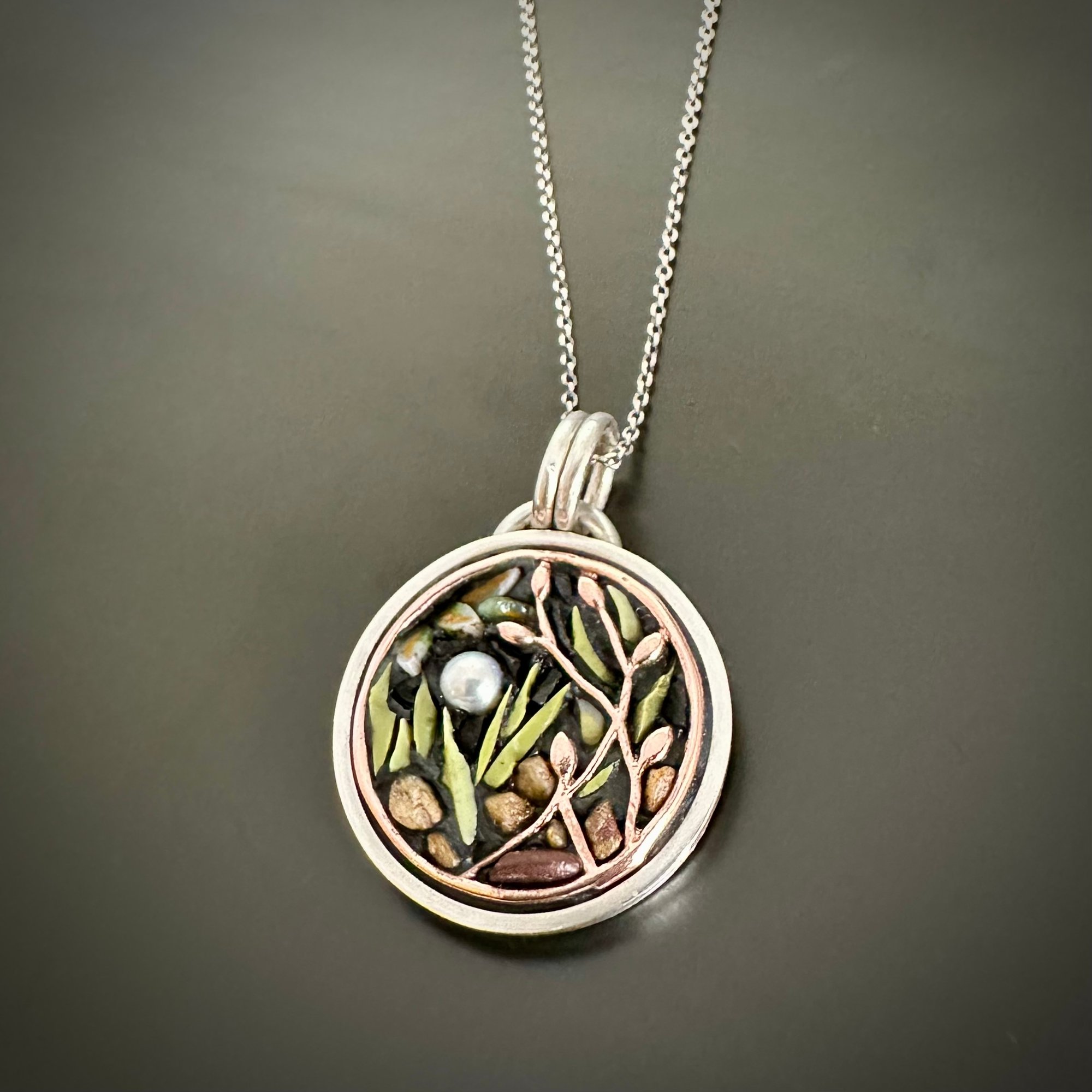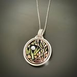 Handcrafted sterling bezel filled with Italian glass, green agate, pearl and 14Krose gold filled vines. Sterling chain with lobster clasp. See Penny for scale.