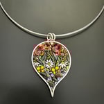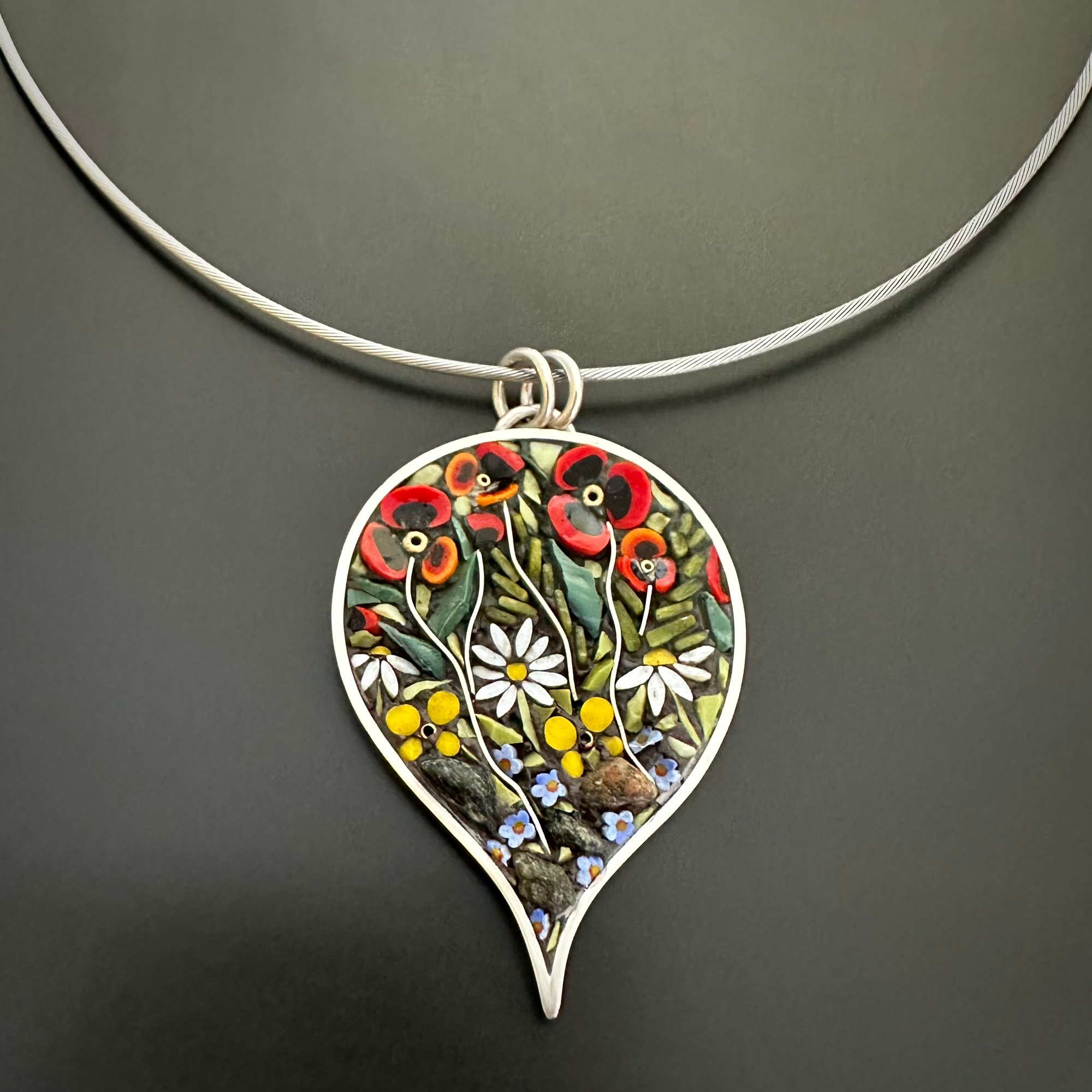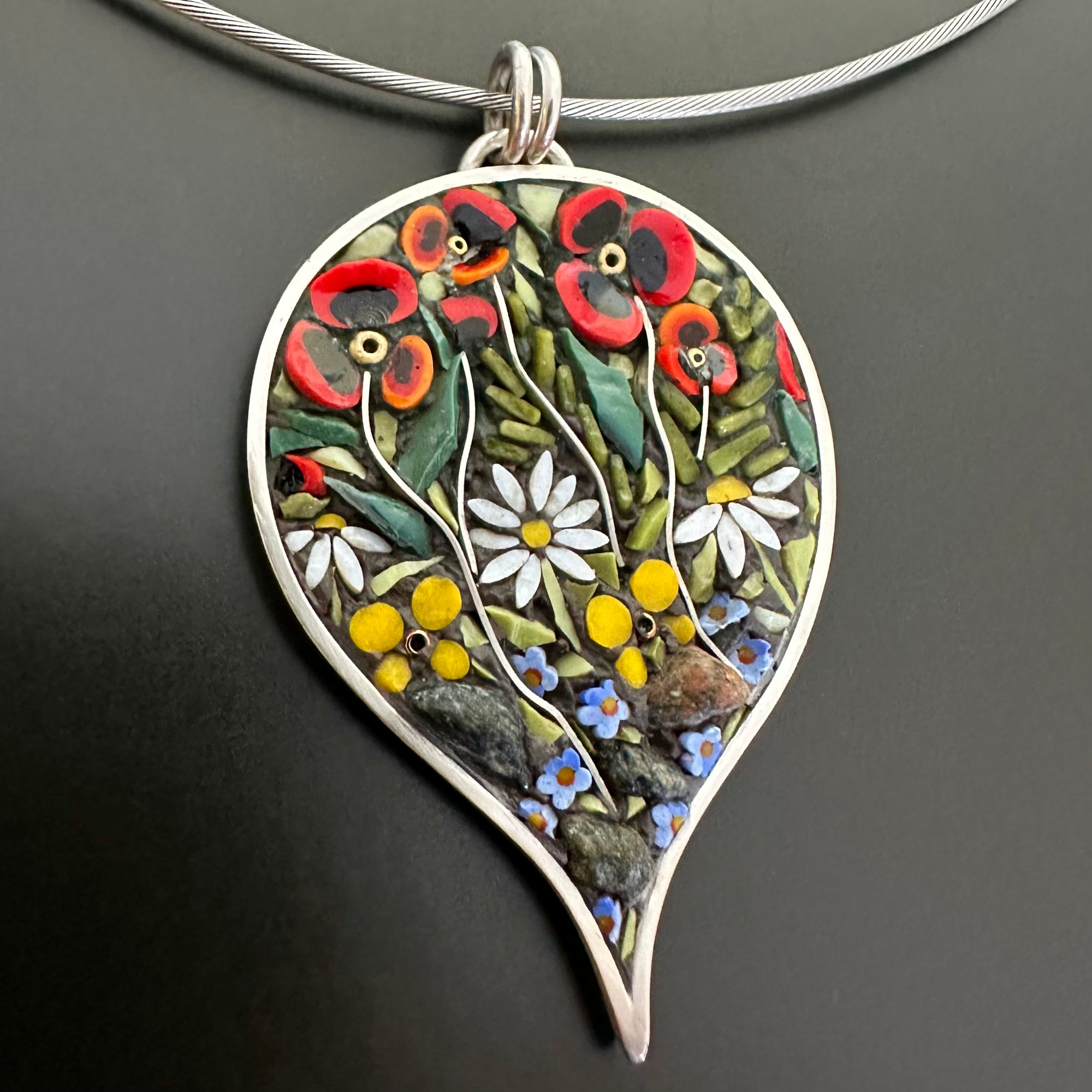 Handcrafted, sterling silver large bezel filled with Italian glass filati Poppies, Daisies, Violets and Forget-me-nots all perched upon Ohiopyle River Rock. Strung on a sterling silver cable wire that adjusts from 16 inches to 18 inches. See penny for scale.