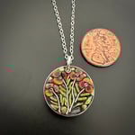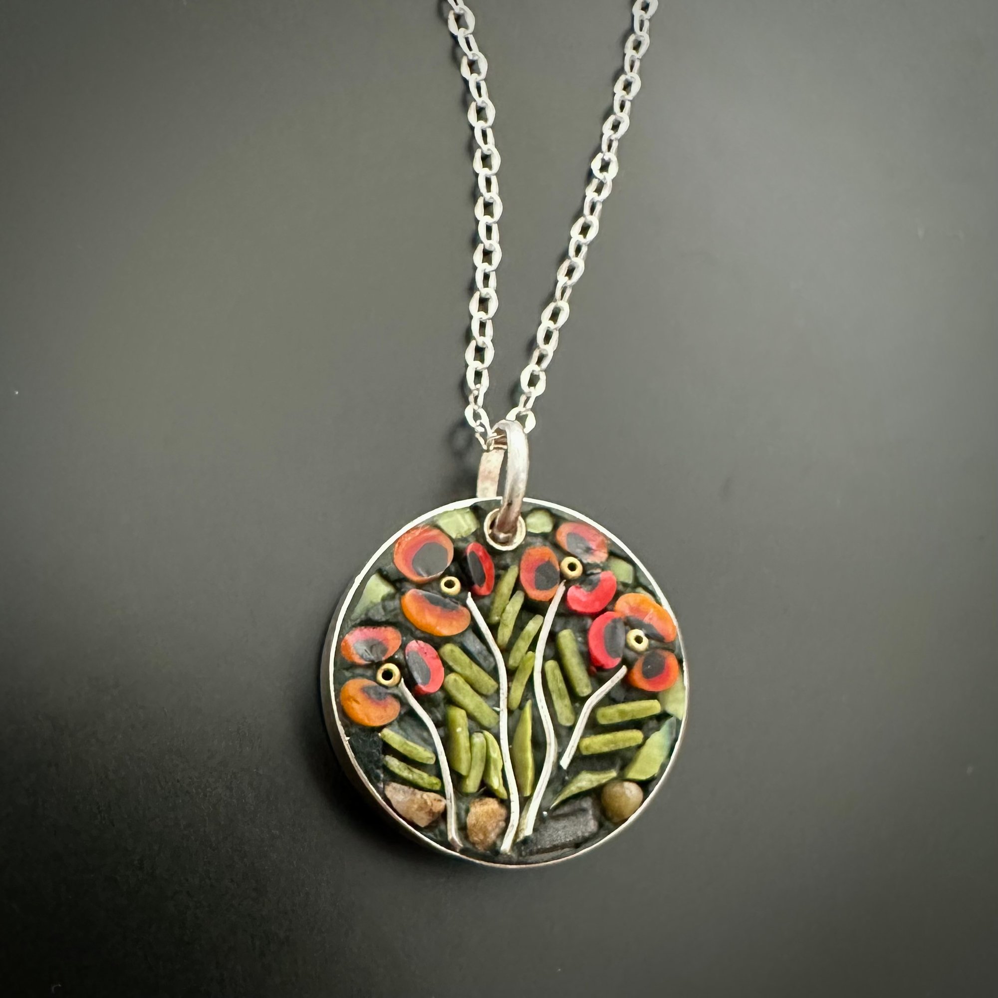 Sterling round bezel filled with Italian glass, green agate. Hung on an 18 inch chain with lobster clasp. See Penny for scale.