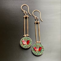 Hand pulled glass filati come together to create red butterfly wings accented with gold filled centers. Butterflies are set in sterling bezels and surrounded by Chrysocolla stone hung on gold filled bars. Earrings measure 2 1/2" long x 5/8" wide. Gold filled ear wires.