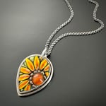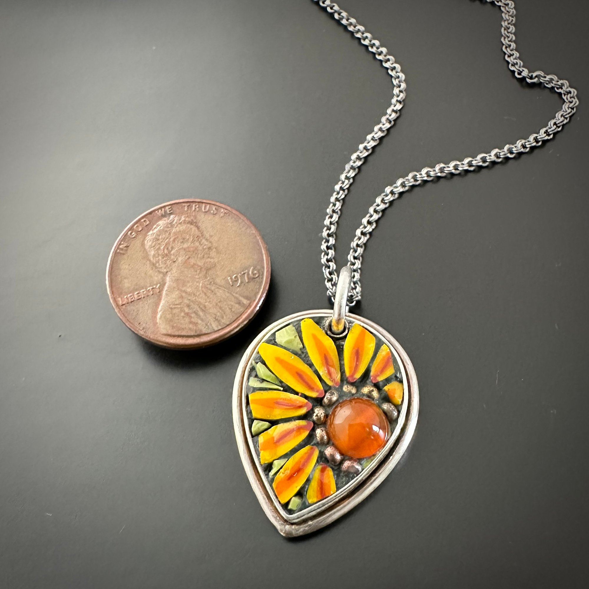 Handcrafted sterling leaf-shaped bezel is filled with Italian filati glass, sterling and Carnelian. Sterling silver 18” chain. Penny in photo for scale.