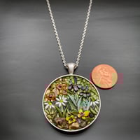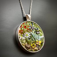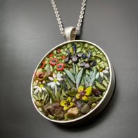 Round Sterling bezel is entirely crafted by hand. Filled with glass Violets, Daisies, Poppies and Iris. Accented with green Agate and Ohiopyle river rock. Hangs on a 24" chain with lobster clasp. Bezel measures 1.5" diameter with .5" bail.