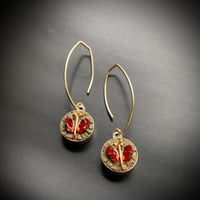 Sterling bezels set with red glass butterfly wings, gold filled centers and accented by green Arizona stone on gold filled ear wires. Earrings measure 3/8" wide x 1 1/2" long.