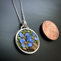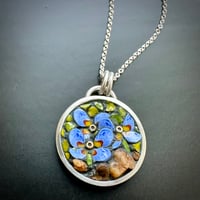 Handcrafted Sterling bezel filled with Italian Filati glass, Ohiopyle river rock. Strung on a sterling silver 18” chain. Penny in photo for scale.